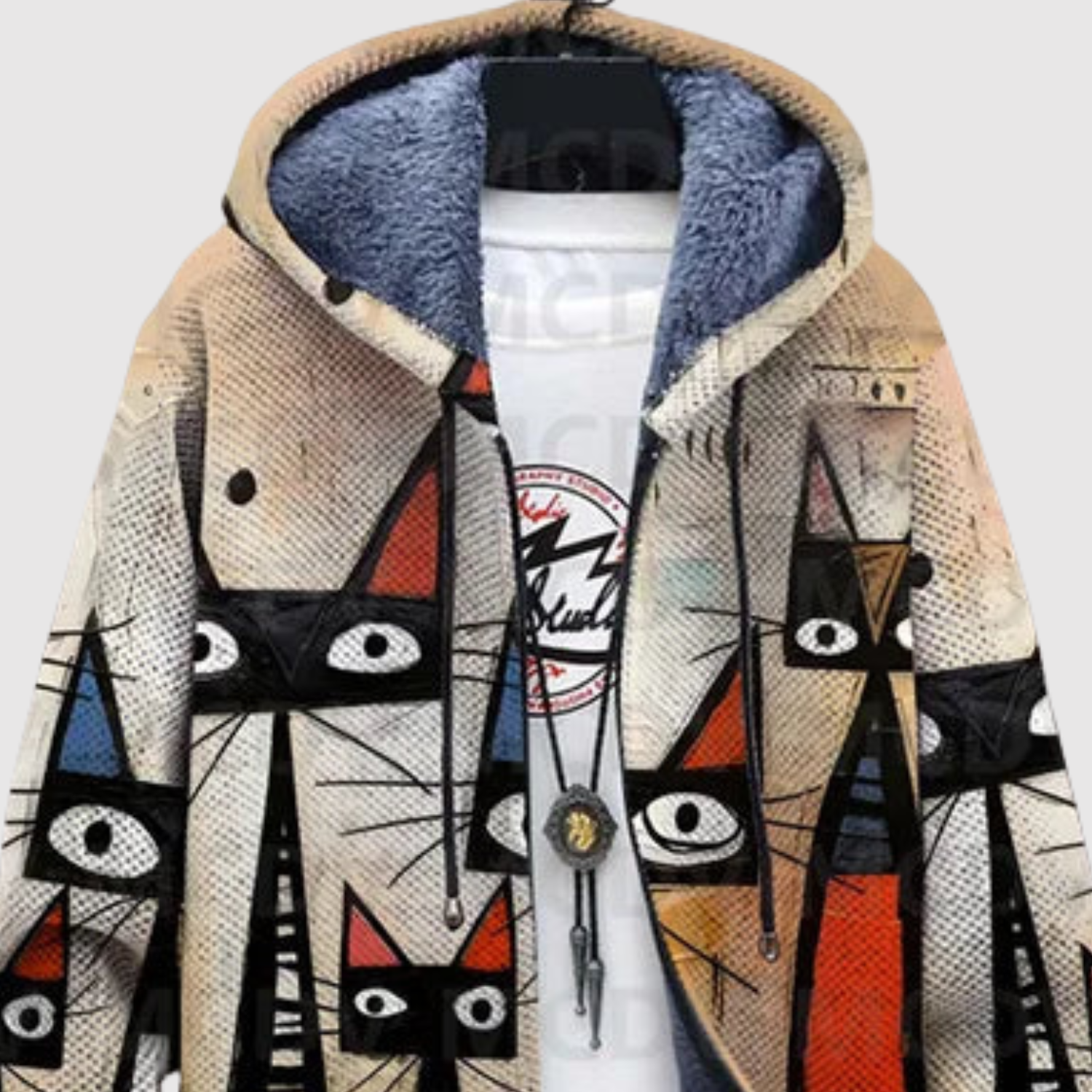 Този суитшърт съчетава хумор и изкуство в уникален дизайн с стилизирани котешки мотиви. Топлите цветове и меката текстура създават релаксиран, но изразителен стил – перфектен за теб, който обича оригиналността.