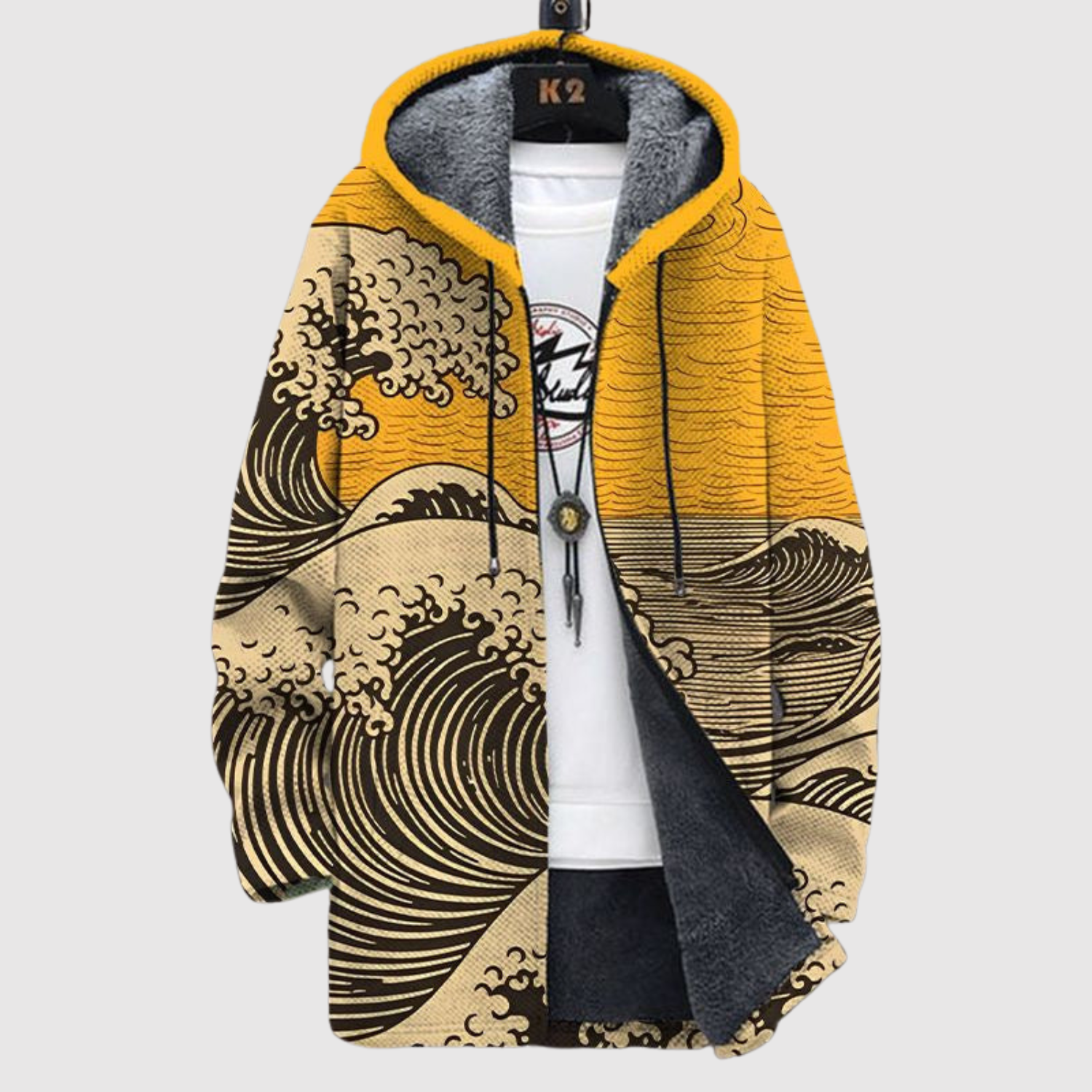 Тази худи е вдъхновена от класически японски вълнообразни мотиви и съчетава традиционен артистичен дизайн с съвременен комфорт. Чистите линии и нежните нюанси придават спокоен, но забележителен вид.