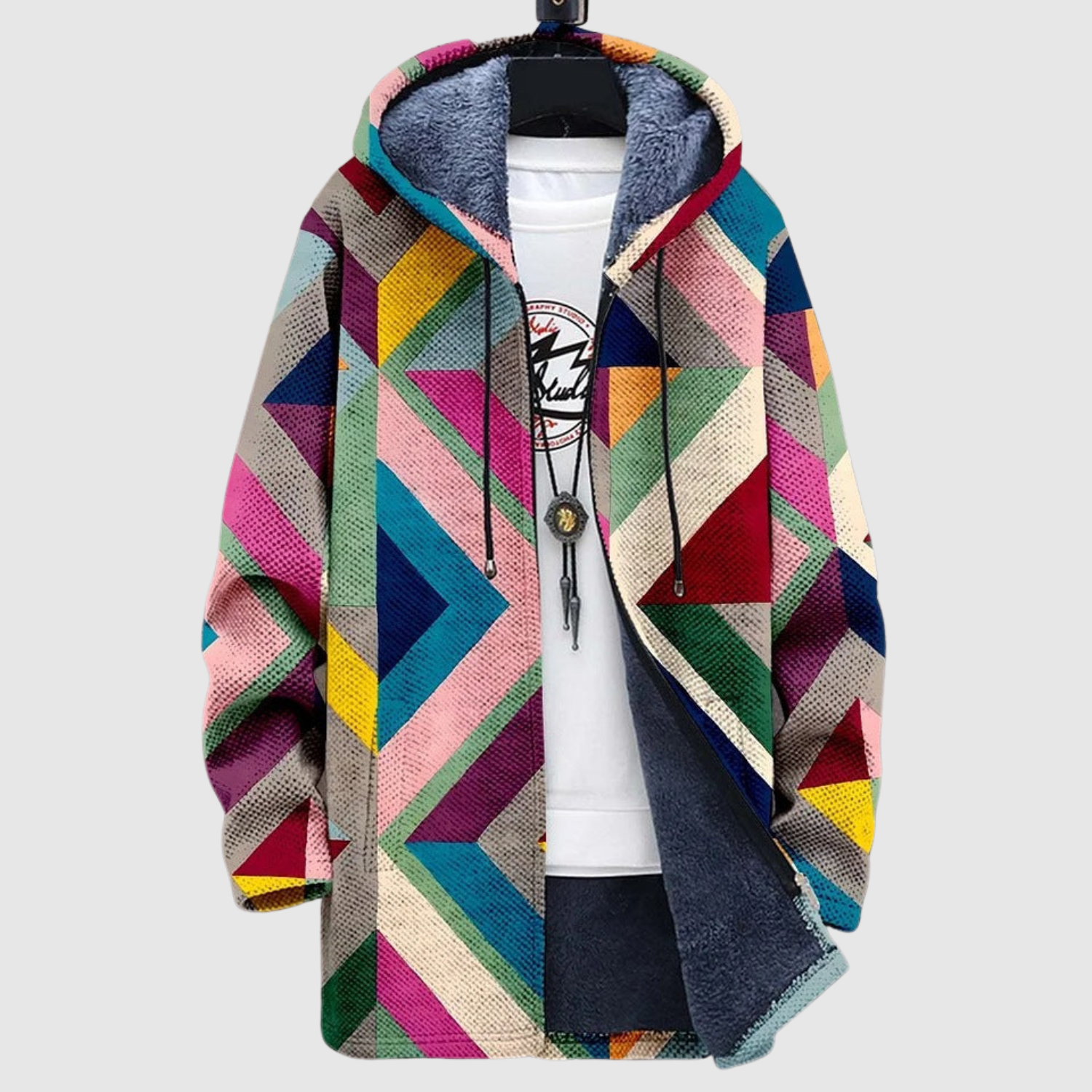 Тази худи съчетава цветове и форми в хармоничен, но игрив модел. Геометричният дизайн придава модерен вид, докато меката вътрешна част осигурява максимален комфорт в ежедневието.