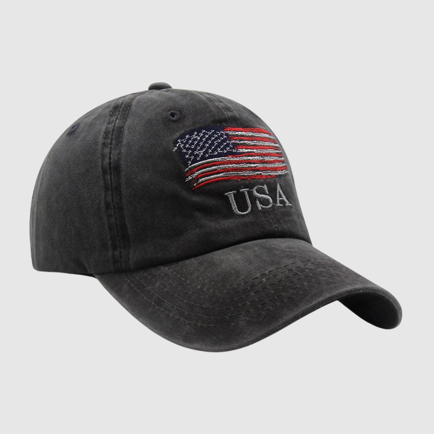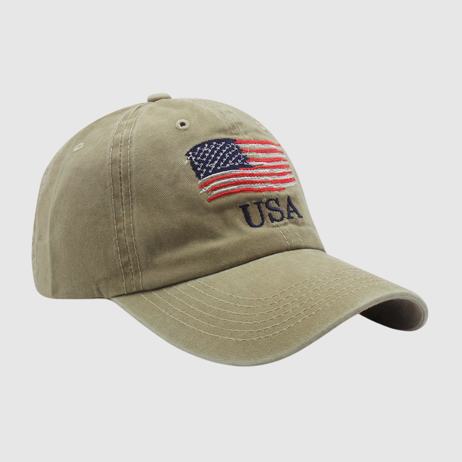 Стилна бейзболна шапка с бродирано знаме на САЩ, която добавя спортен и забележим вид. Изработена от издръжлив памук с регулируемо закопчаване за максимален комфорт в ежедневието.