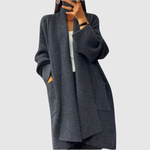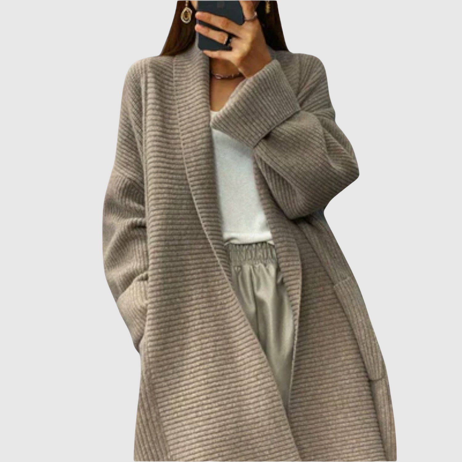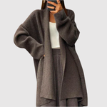 Този кардиган е изработен от плътен и мек вязан материал, който предлага много топлина и уют. С дългия си силует, широки ръкави и свободна кройка, той е перфектен като допълнителен слой в хладни дни. Вечна част, която комбинира комфорт и минималистичен северен дизайн.
