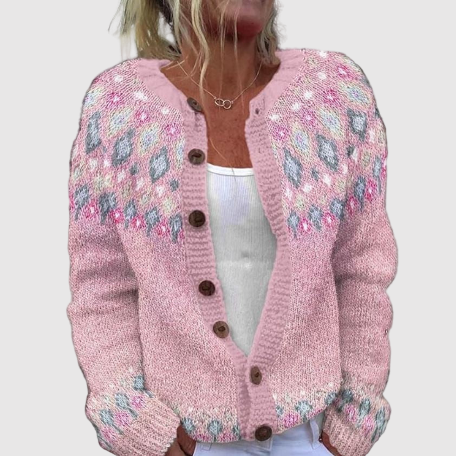 Уютен кардиган с красиво северноизточно вдъхновен мотив. Перфектен за топлина и стил в хладни дни. Мекото плетиво и ярките цветове го правят привлекателен акцент в гардероба.