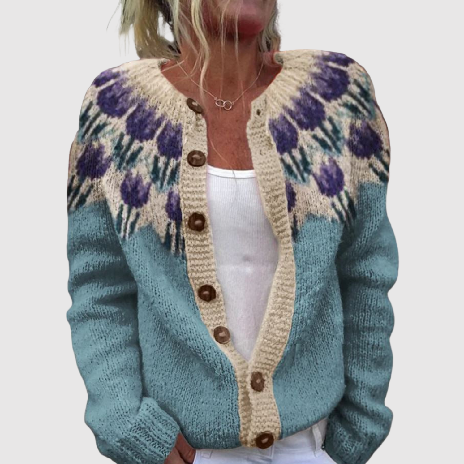 Топъл и мек кардиган с красиво nordisk mønster около врата. Класическото закопчаване с копчета го прави лесен за стилизиране както отворен, така и затворен. Перфектен за създаване на небрежен, но стилен вид през студените месеци.