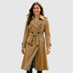 Този тренчкот комбинира класически дизайн с модерна функционалност. Той има фигурално изрязване, свалящ се колан и двуредно закопчаване с копчета, което придава изискан и стилен вид. Идеален както за всекидневна употреба, така и за по-формални поводи.