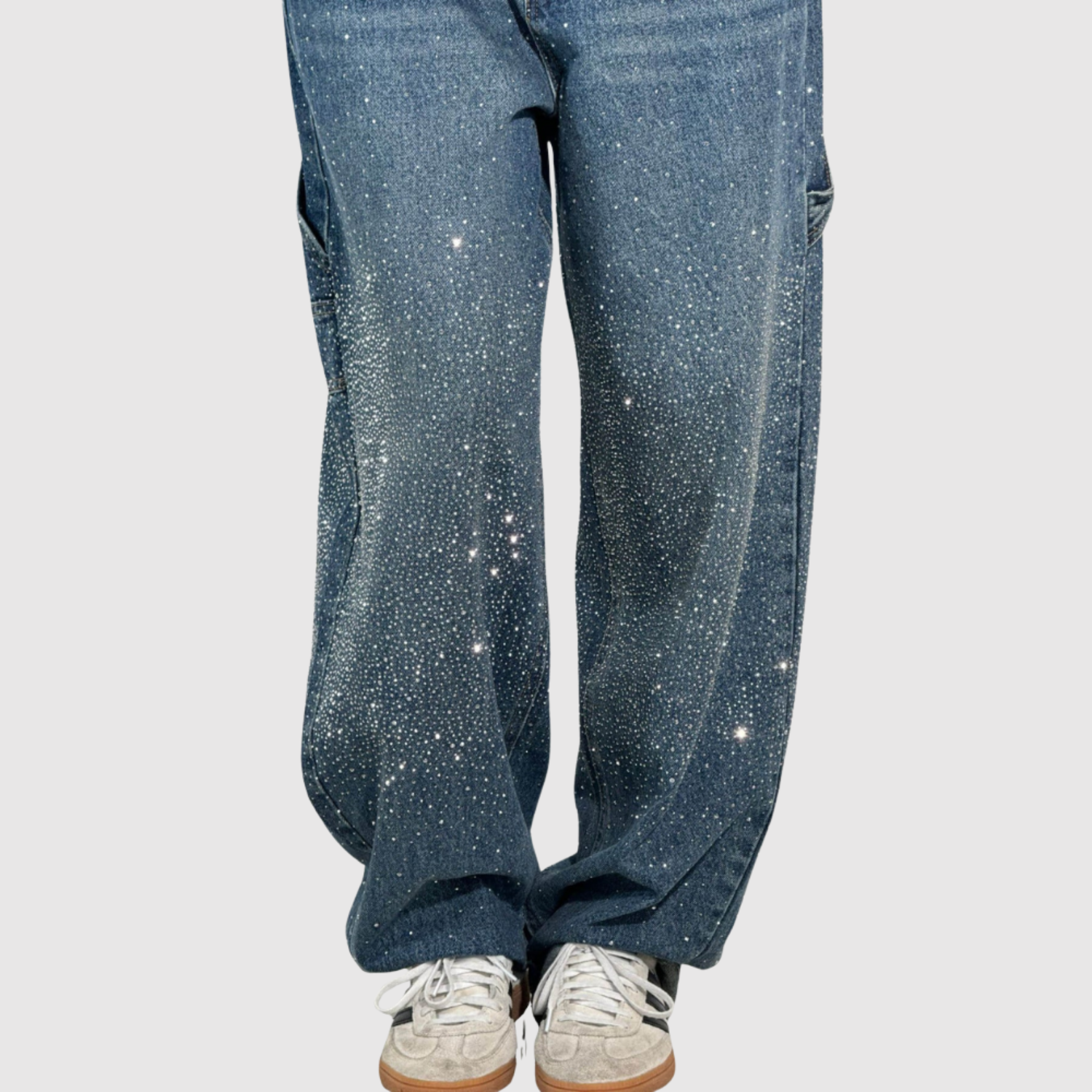 Тези баги дънки предлагат страхотен и модерен вид с уникалните си спрей детайли. Свободната кройка осигурява комфорт и свобода на движение, докато вие получавате стилен израз. Перфектни за вас, които искате градски и удобен аутфит.