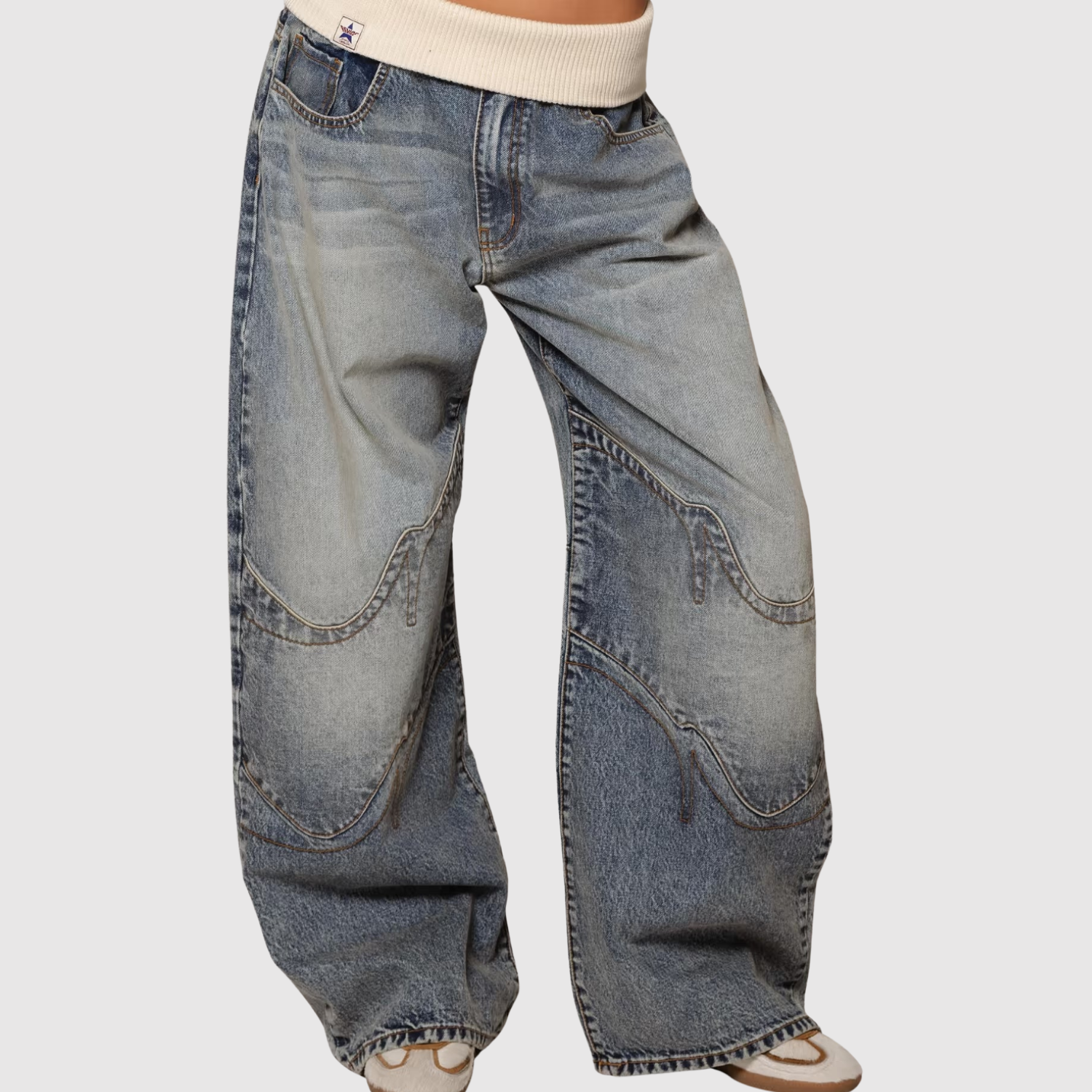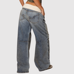 Тези дънки с ниска талия комбинират неформален урбан стил с широк силует, който осигурява комфорт и модерен вид едновременно. Дизайнът им с контрастни шевове придава както ретро, така и модерен акцент, което ги прави идеален избор за тези, които искат да се открояват с личност. Перфектни за неформални, улични и удобни аутфити.
