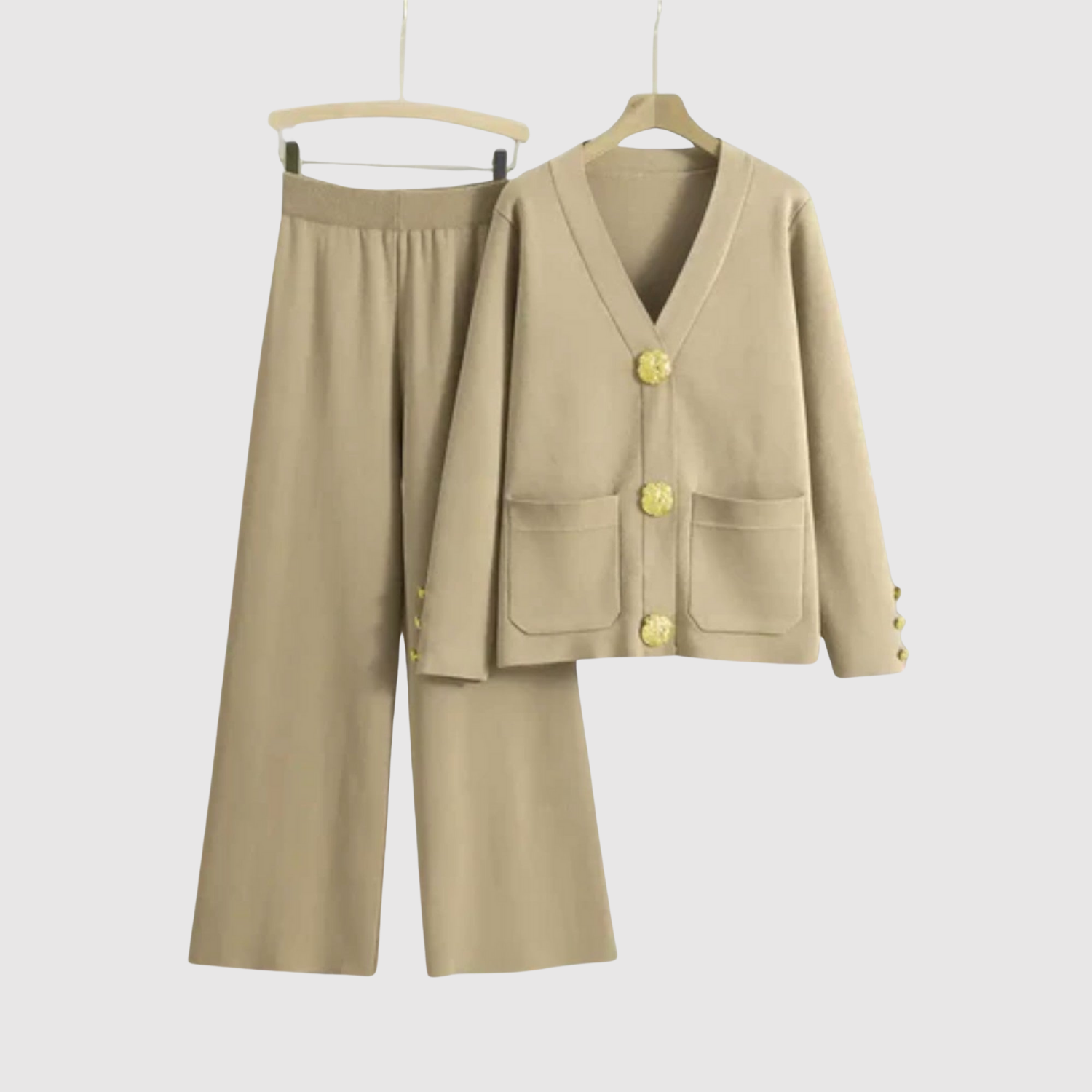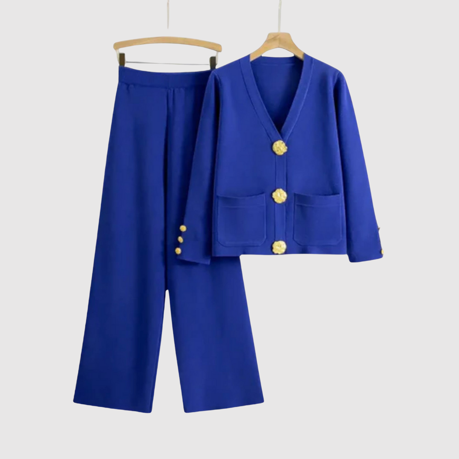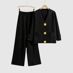 Този гащеризон комбинира минималистичен дизайн с луксозни детайли. Изразителните златни копчета добавят софистициран акцент, докато комфортната кройка прави комплекта идеален както за офис, така и за вечери навън. Задължителен елемент за съвременния гардероб.