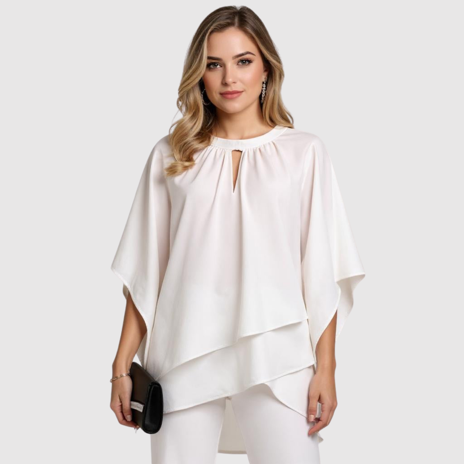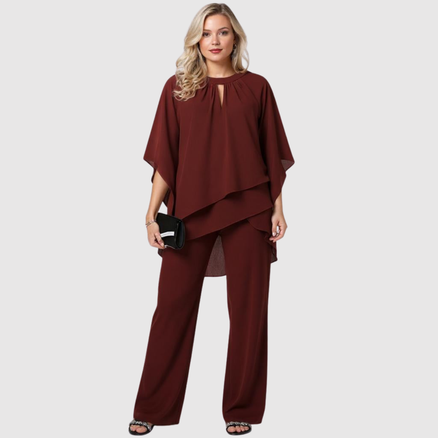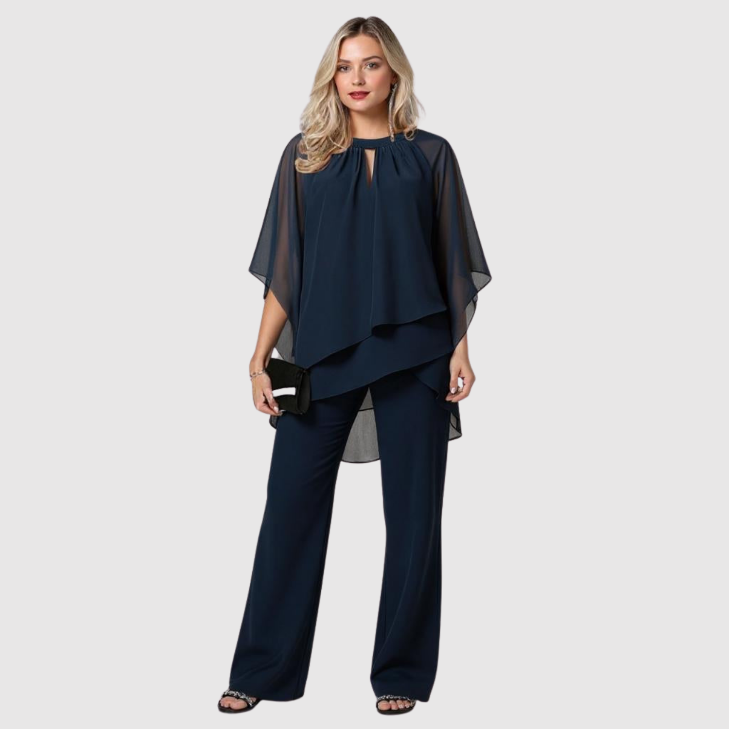 Този елегантен комплект се състои от свободен топ с асиметричен пад и съответстващи панталони. Дизайнът придава изискан вид, докато въздушната кройка осигурява максимален комфорт през целия ден. Перфектен както за офис, вечери, така и за празнични поводи.