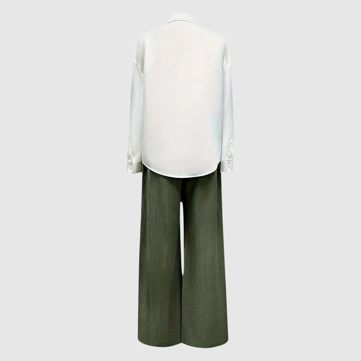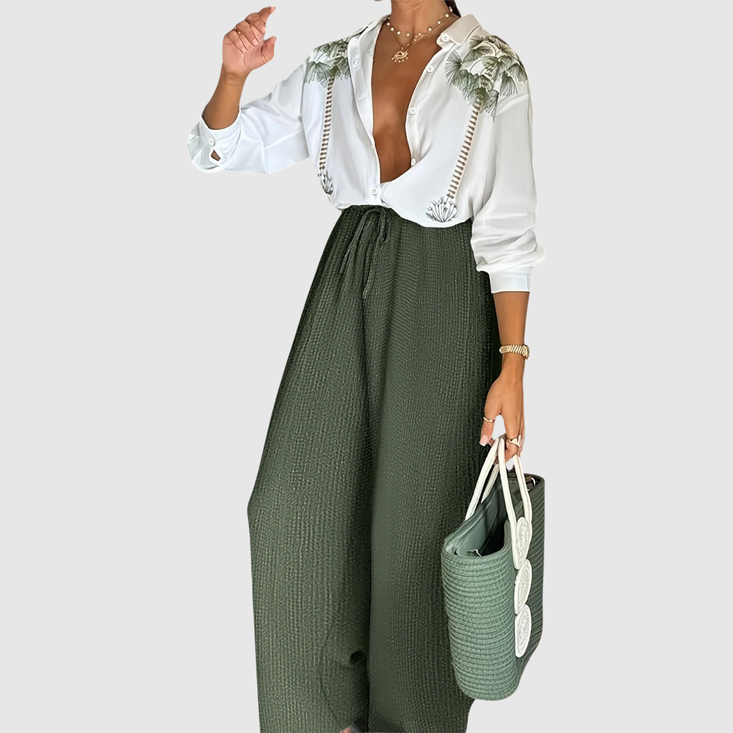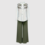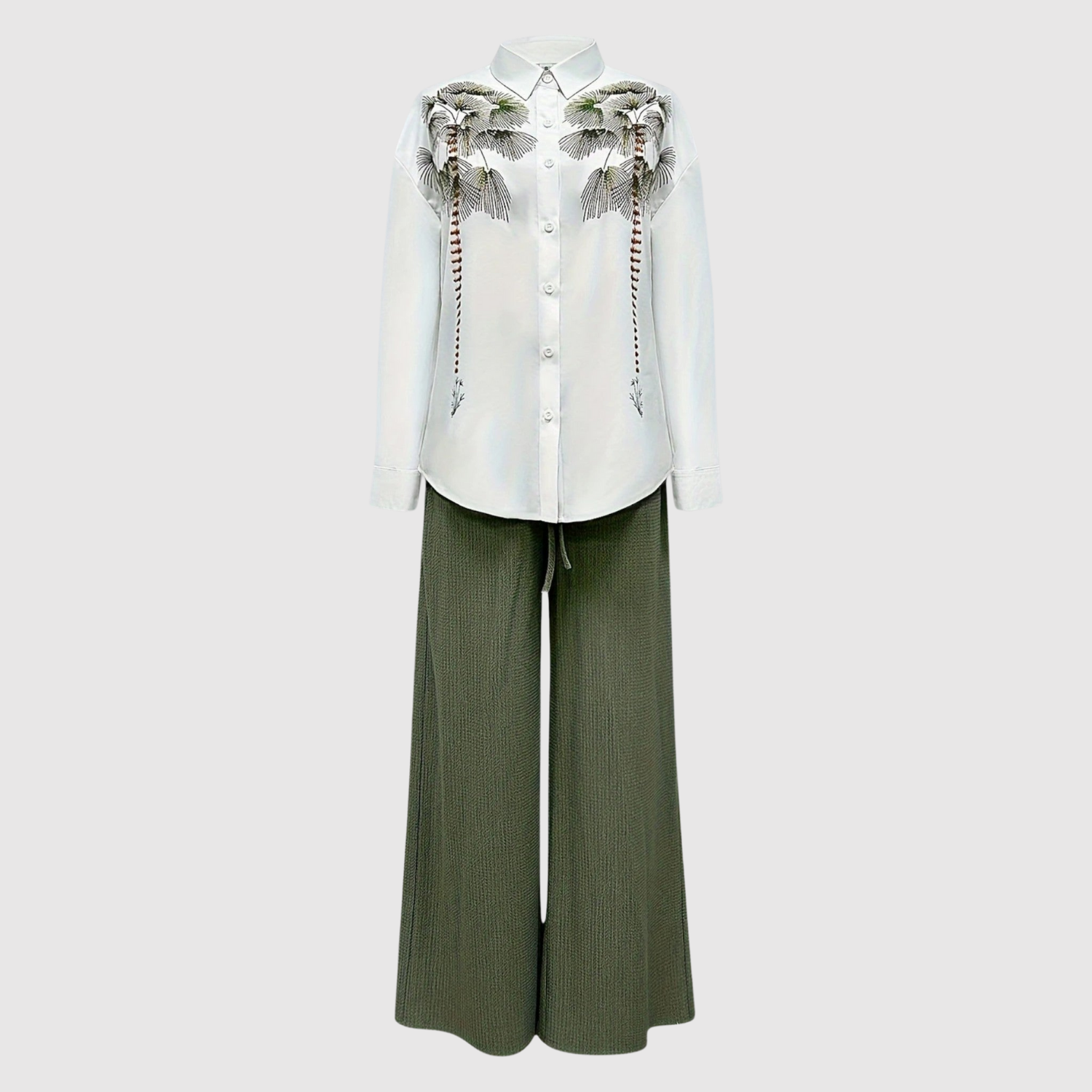 Софистициран комплект, състоящ се от бяла риза с цветни детайли и високи, широки панталони. Перфектен както за ежедневна употреба, така и за специални поводи, когато искате комфорт без компромис с елегантността.