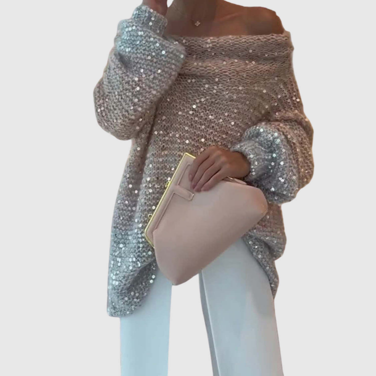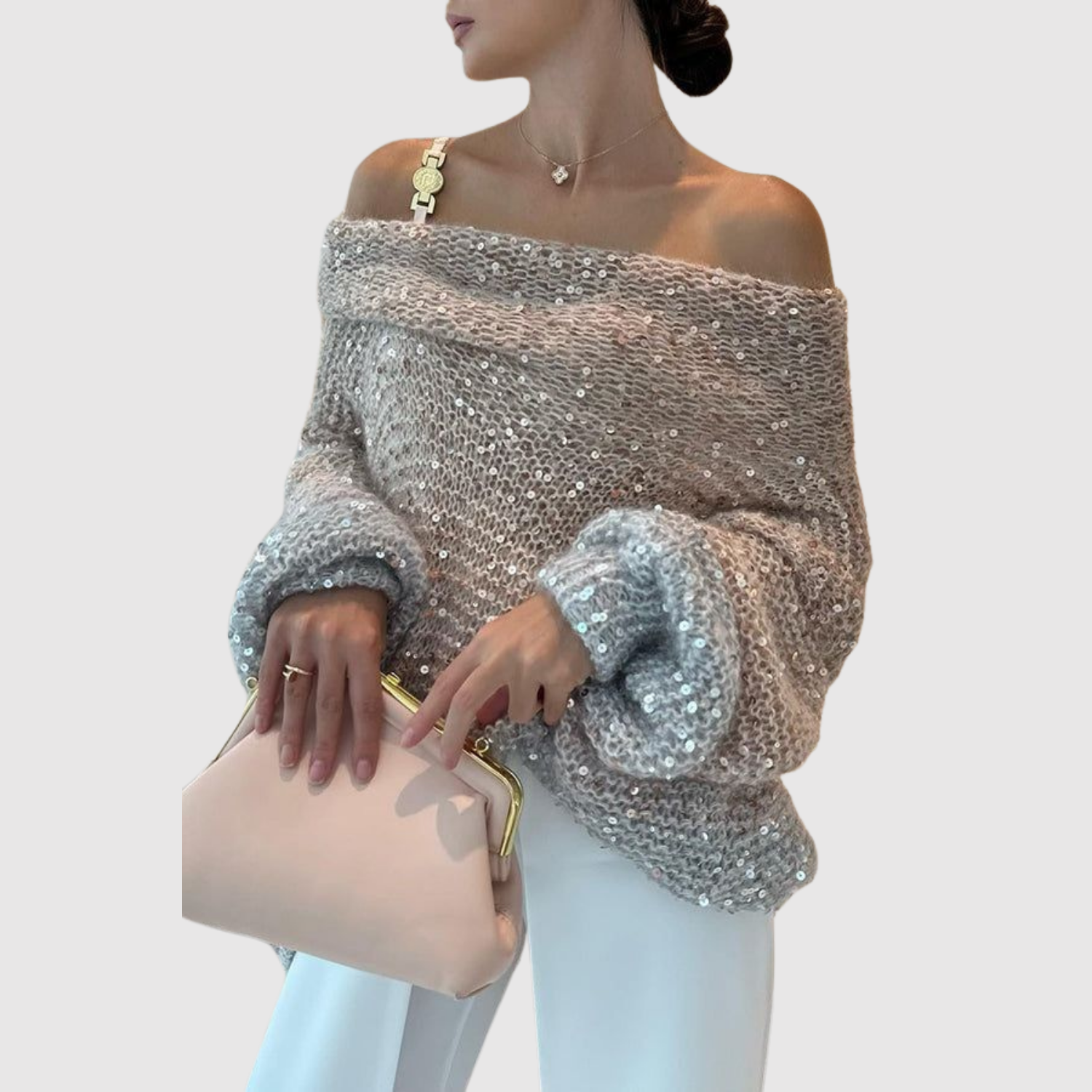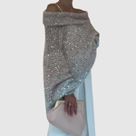 Клара – Блестящ пуловер с открито рамо