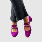 Тези лилави балерини с тройни ремъци комбинират елегантност с игриво излъчване. Квадратният нос и ниският ток осигуряват стабилност и комфорт през целия ден. Яркият цвят прави обувките стилно изявление, което повдига както ежедневни, така и празнични тоалети. Перфектен избор за теб, ако искаш модерен и уникален детайл в гардероба.