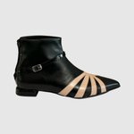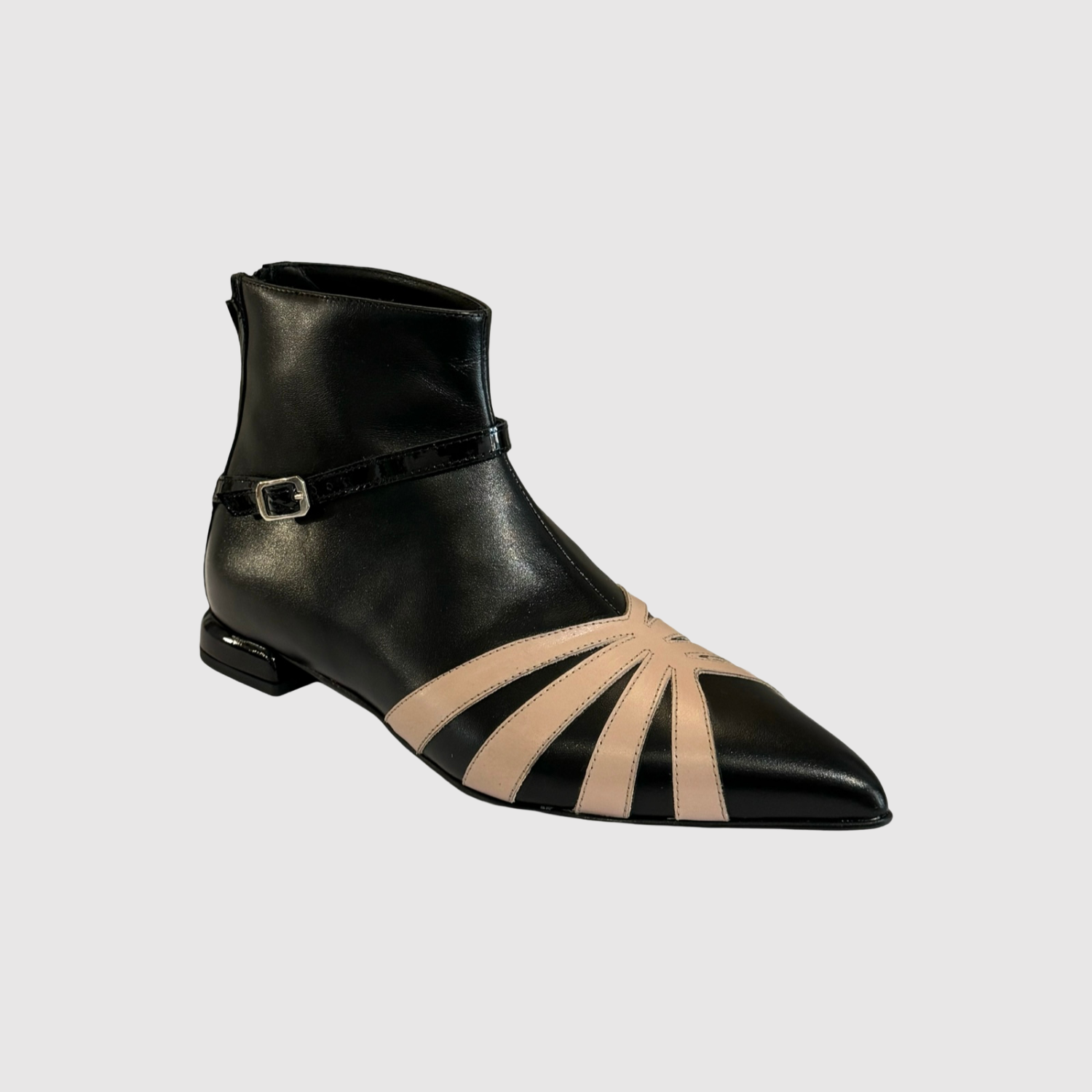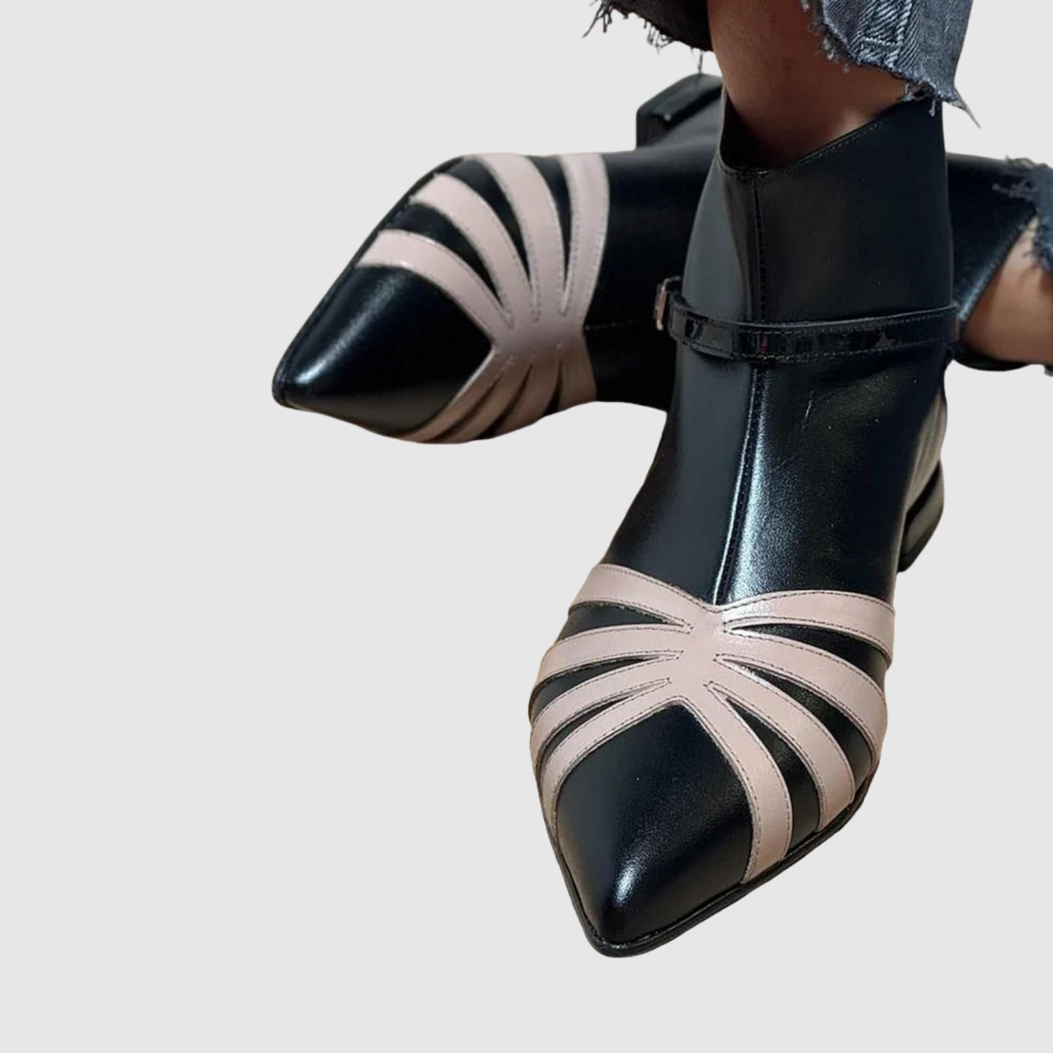 Тези ботуши комбинират геометричен модел отпред с елегантен остър нос, което придава сложен и привлекателен вид. Регулируемата лента около глезена осигурява стабилност, докато гъвкавата подметка ги прави удобни за целодневно носене. Перфектни за както неформални, така и по-официални тоалети – идеален избор за жени, които искат да се открояват.
