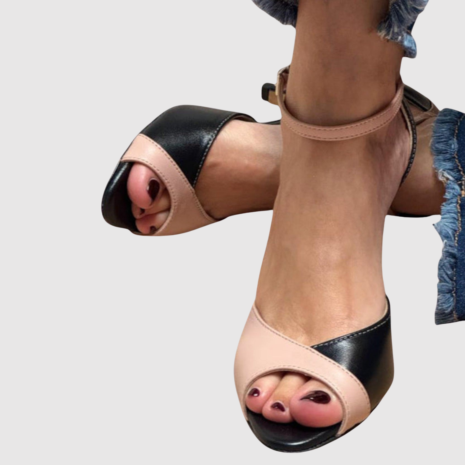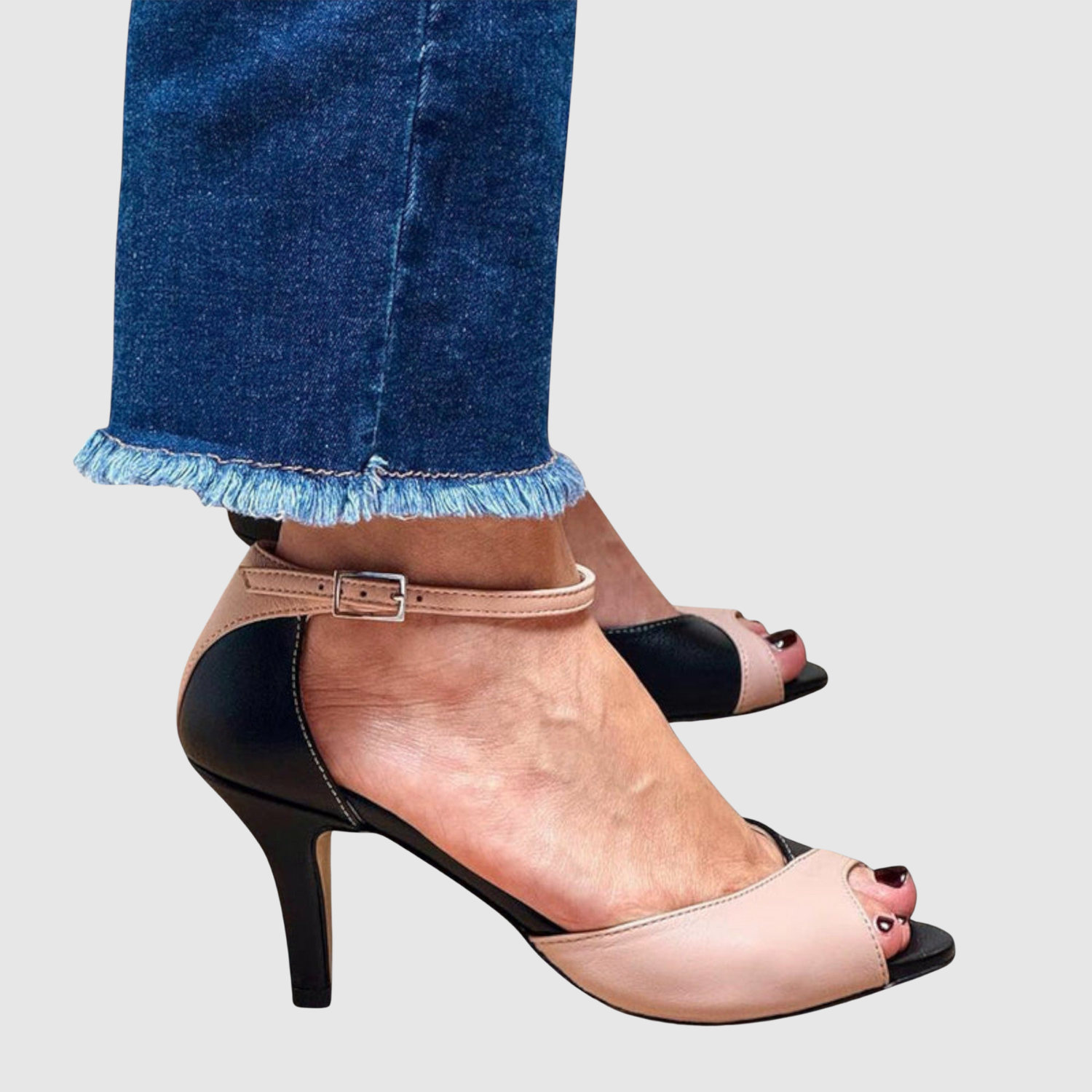 Тези сандали комбинират изискано двуцветно дизайнерско решение с женствен вид с отворени пръсти. Регулируемата лента около глезена осигурява стабилност, докато меката стелка предлага комфорт през целия ден. С елегантен ток, те са идеални както за офис, така и за вечерни събития, където стилът и увереността са в центъра на вниманието.