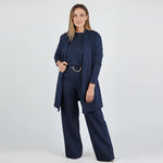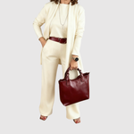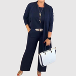Този елегантен комплект комбинира лека риза с широки панталони за стилен и женствен вид. Перфектен за работа, вечери навън и спокойни дни със стил.