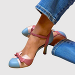 Тези обувки на висок ток комбинират уникален дизайн в меки цветове с деликатна предна панделка, която подчертава женствеността и придава очарователен ретро вид. Средновисокият ток осигурява перфектната височина, за да подчертае фигурата, без да се жертва комфортът, а регулируемата лента гарантира здраво и елегантно прилягане. Перфектни за специални поводи, вечери или за добавяне на изискано докосване към ежедневния ви вид.