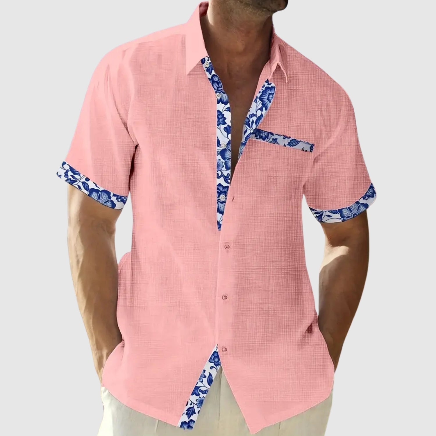 С дизайн, създаден за слънчеви дни, тази къс ръкав риза комбинира свежест и елегантност с живо докосване. Контрастните детайли на яка, джоб и ръкави добавят характер на небрежния вид, идеален за плажа, града или летен излет.