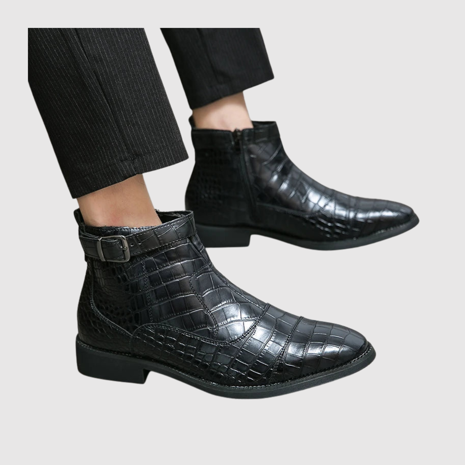 Ботушите Хенрик Кроко съчетават луксозна текстура с безвременна елегантност. Натиснатата кожа създава характерен вид, който добавя щрих на ексклузивност към всяко облекло. С цип отстрани за лесно обуване и удобна подметка, получавате както комфорт, така и класика в едно дизайнерско решение — перфектни за вечерни излизания и стилни ежедневия.