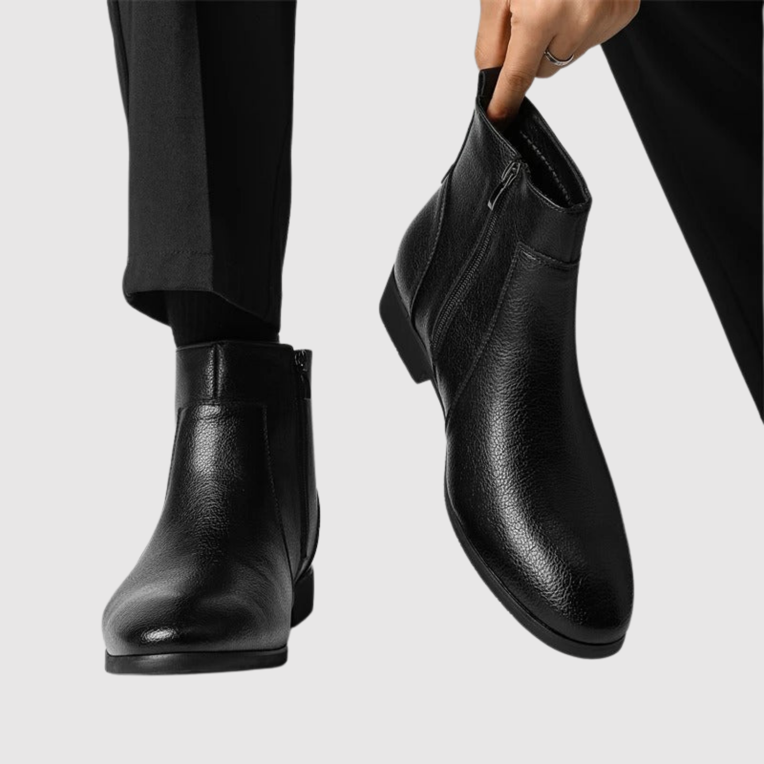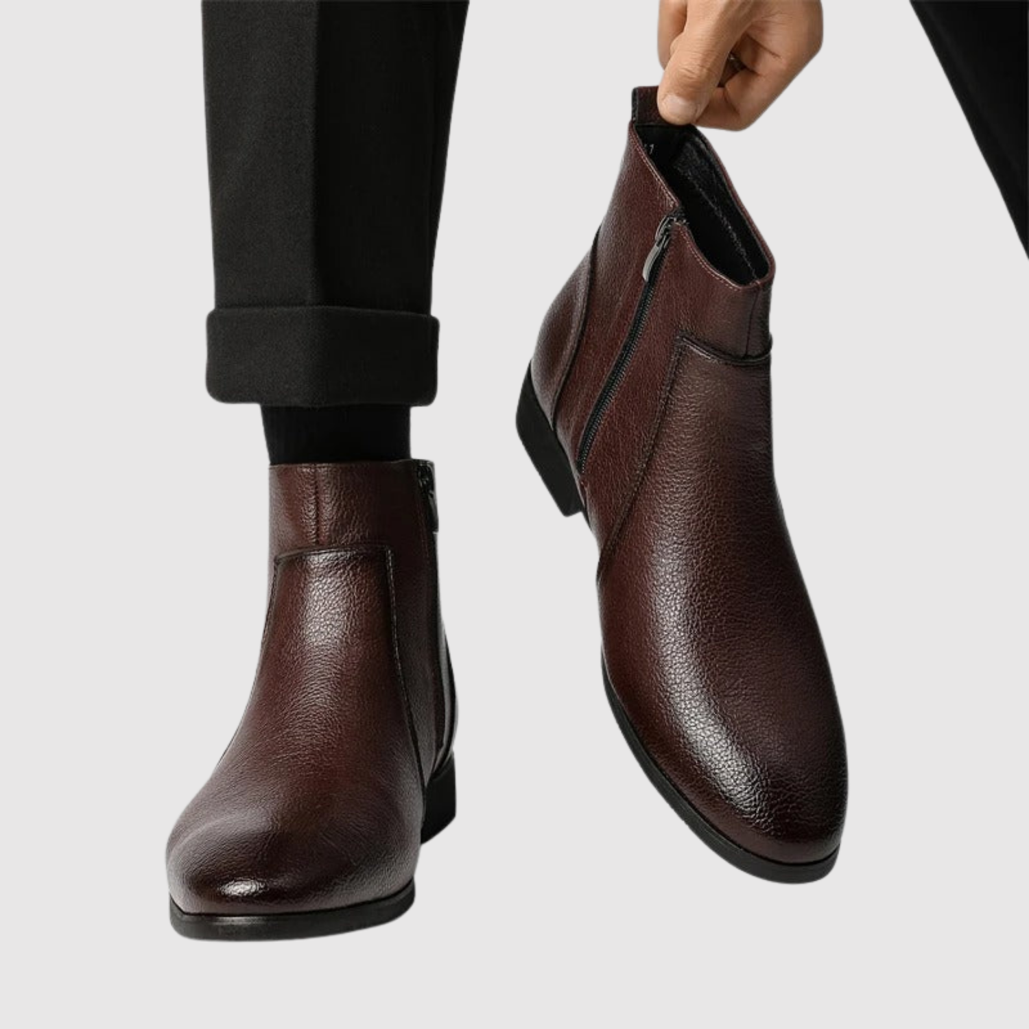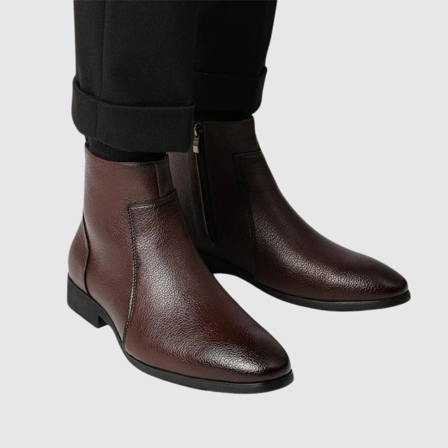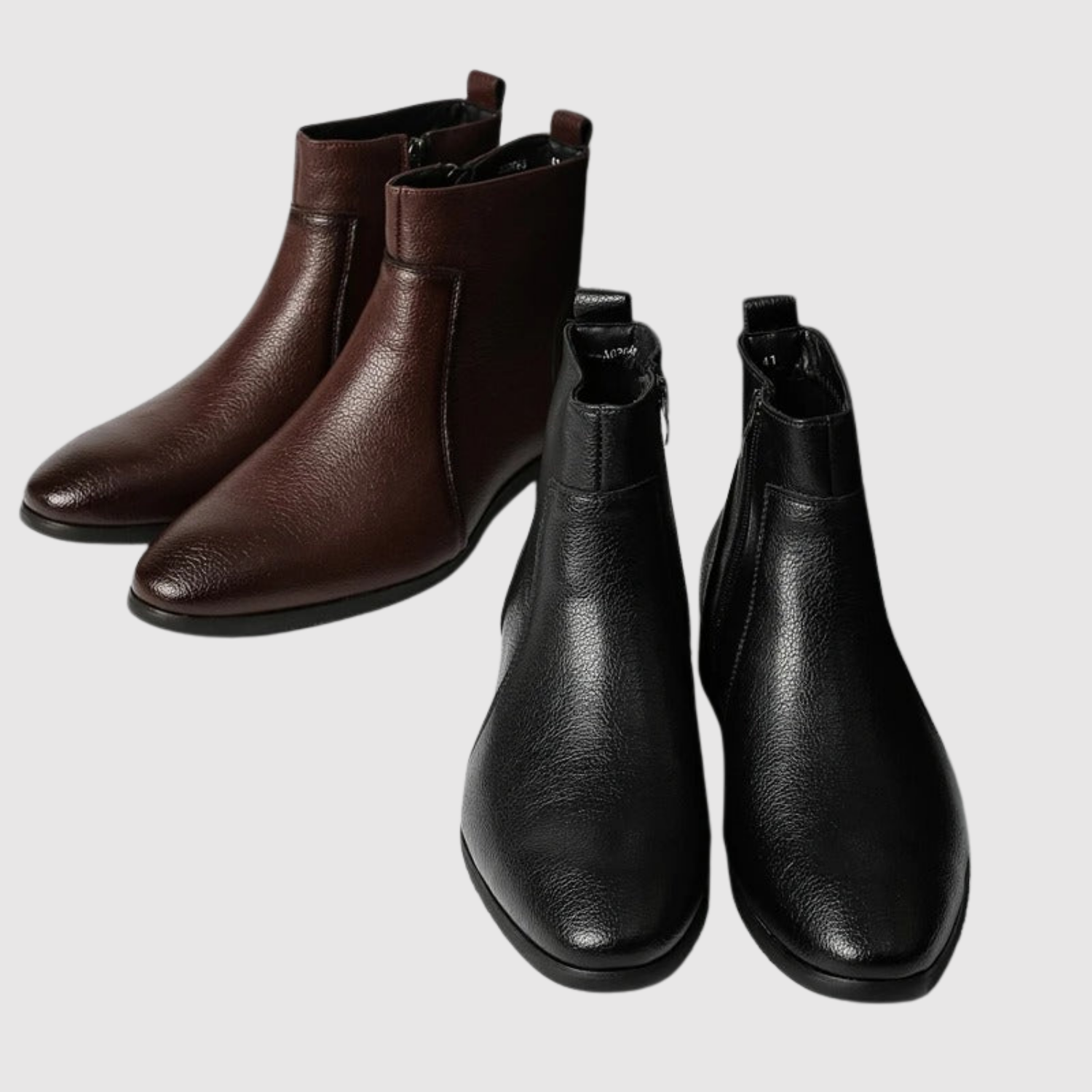 Тези Челси обувки от релефна кожа съчетават класическа елегантност с модерен привкус. Текстурираната повърхност придава уникален вид, докато еластичният страничен панел ги прави лесни за обуване и събуване. Идеални за работа и свободно време.
