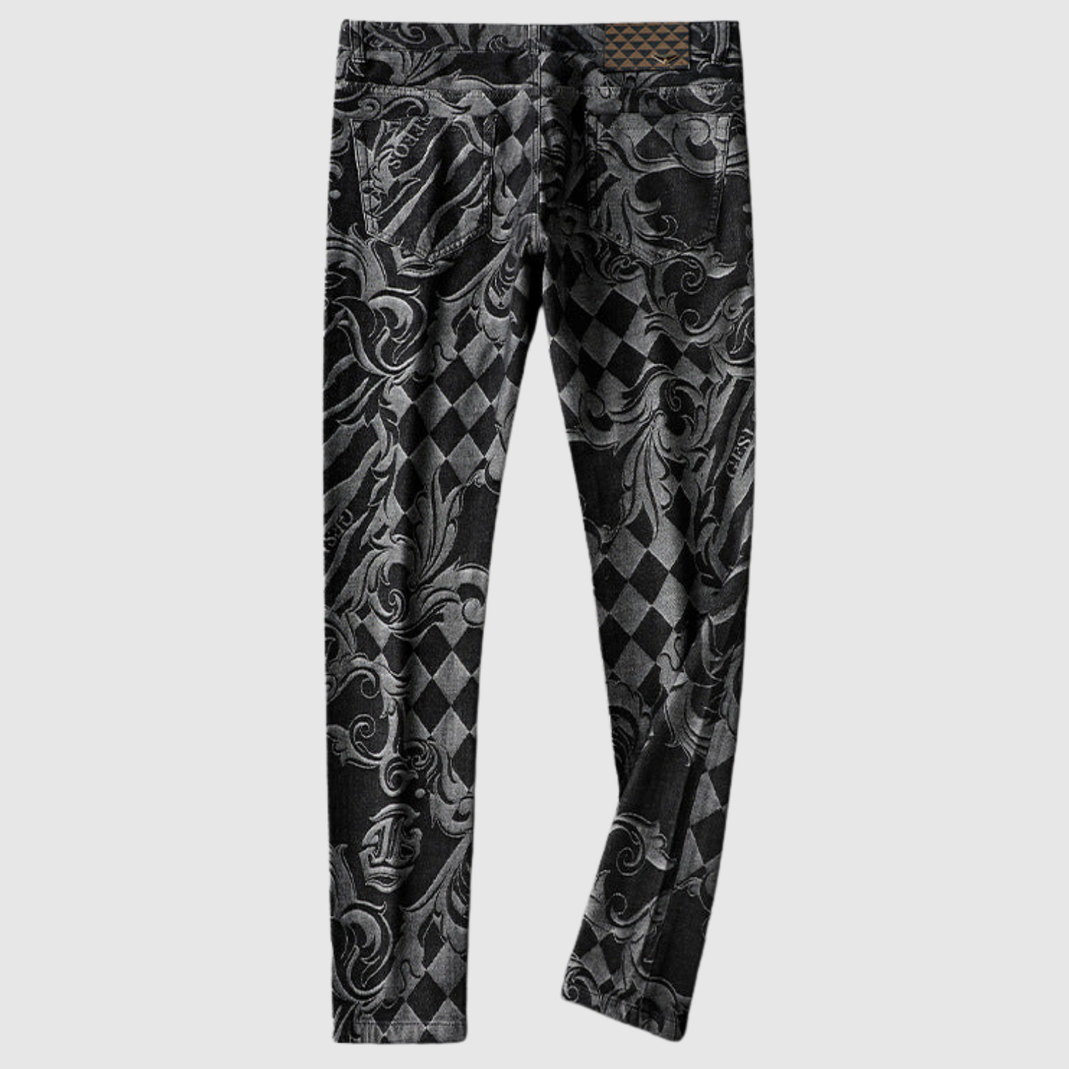Тези дънки комбинират барокови извивки с харлекин вдъхновени диаманти за смело и вечно излъчване. Детайли като шарен патч и метален емблема завършват дизайна и подчертават ексклузивния характер.