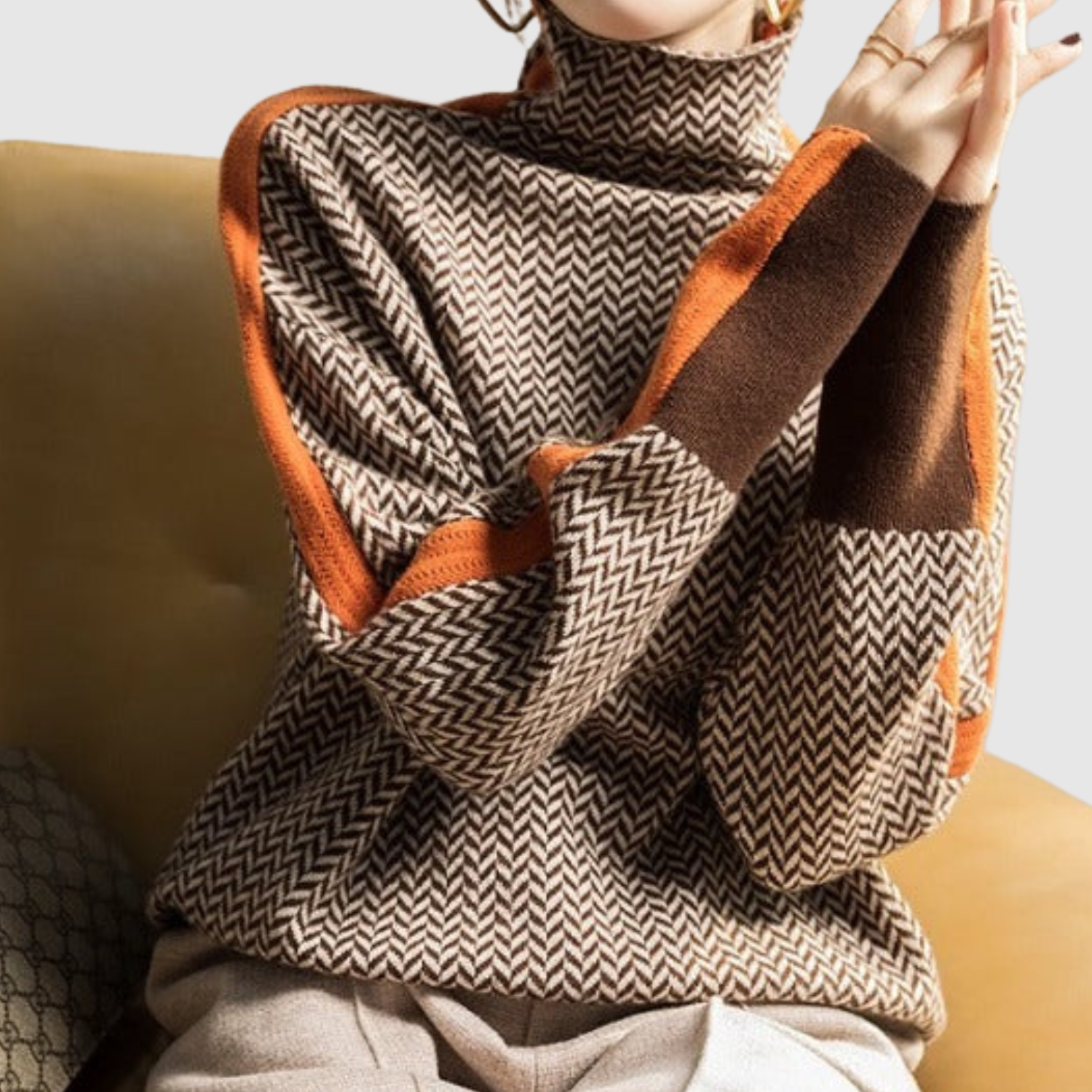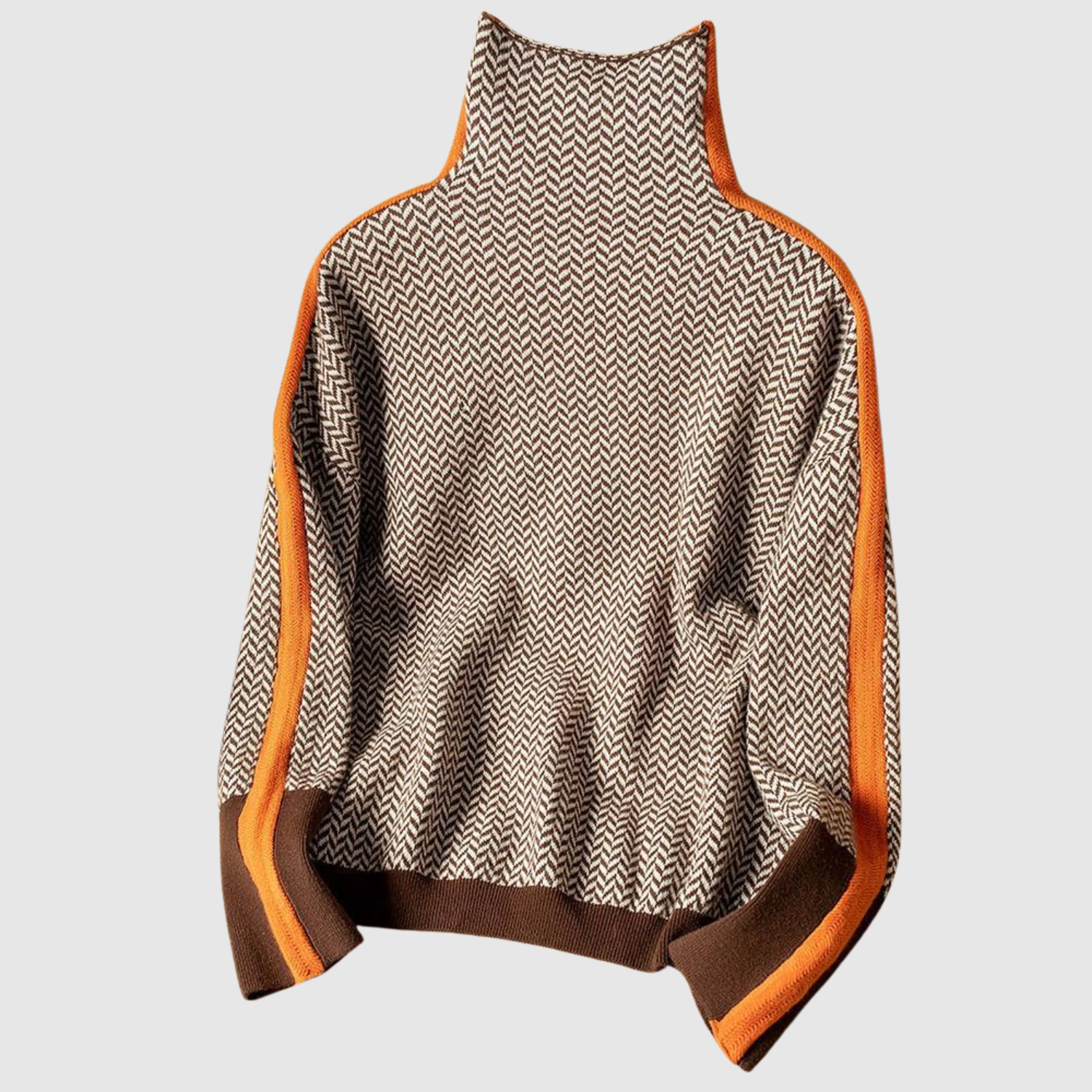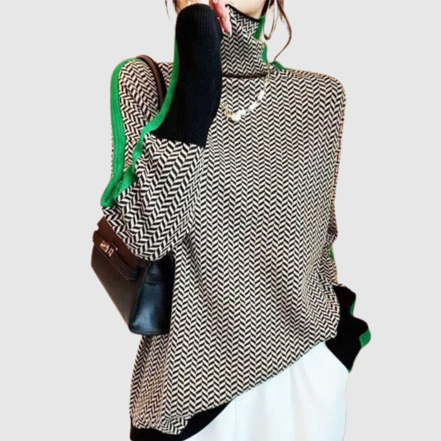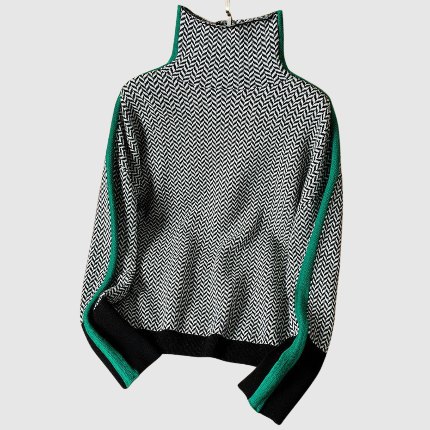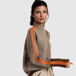 Този пуловер комбинира изчистена визия с модерни цветни детайли по ръкавите.