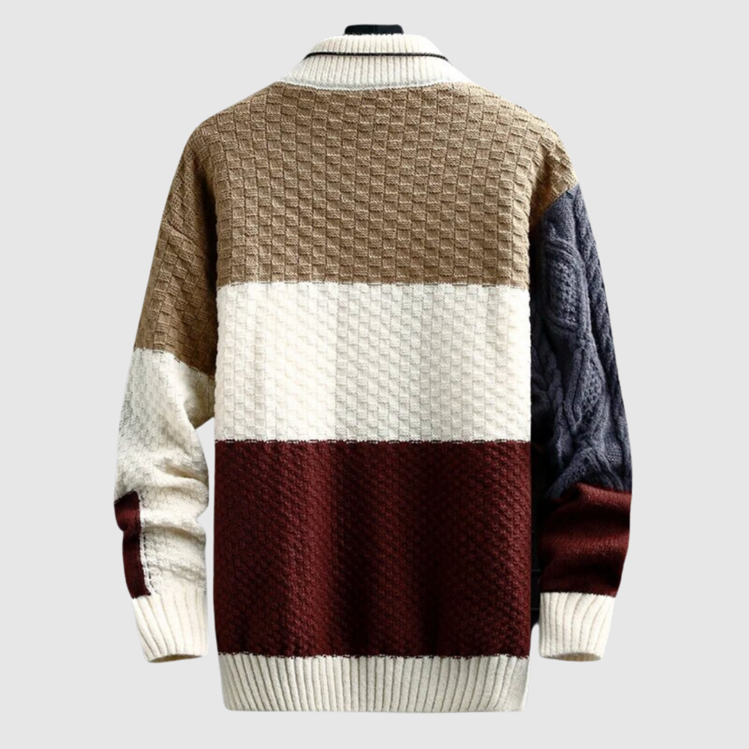 Модерен пуловер, който съчетава топлина и комфорт с артистичен дизайн на цветни блокове. Високата яка и здравата структура го правят идеален за хладните зимни дни, като същевременно запазва стилен и градски вид.