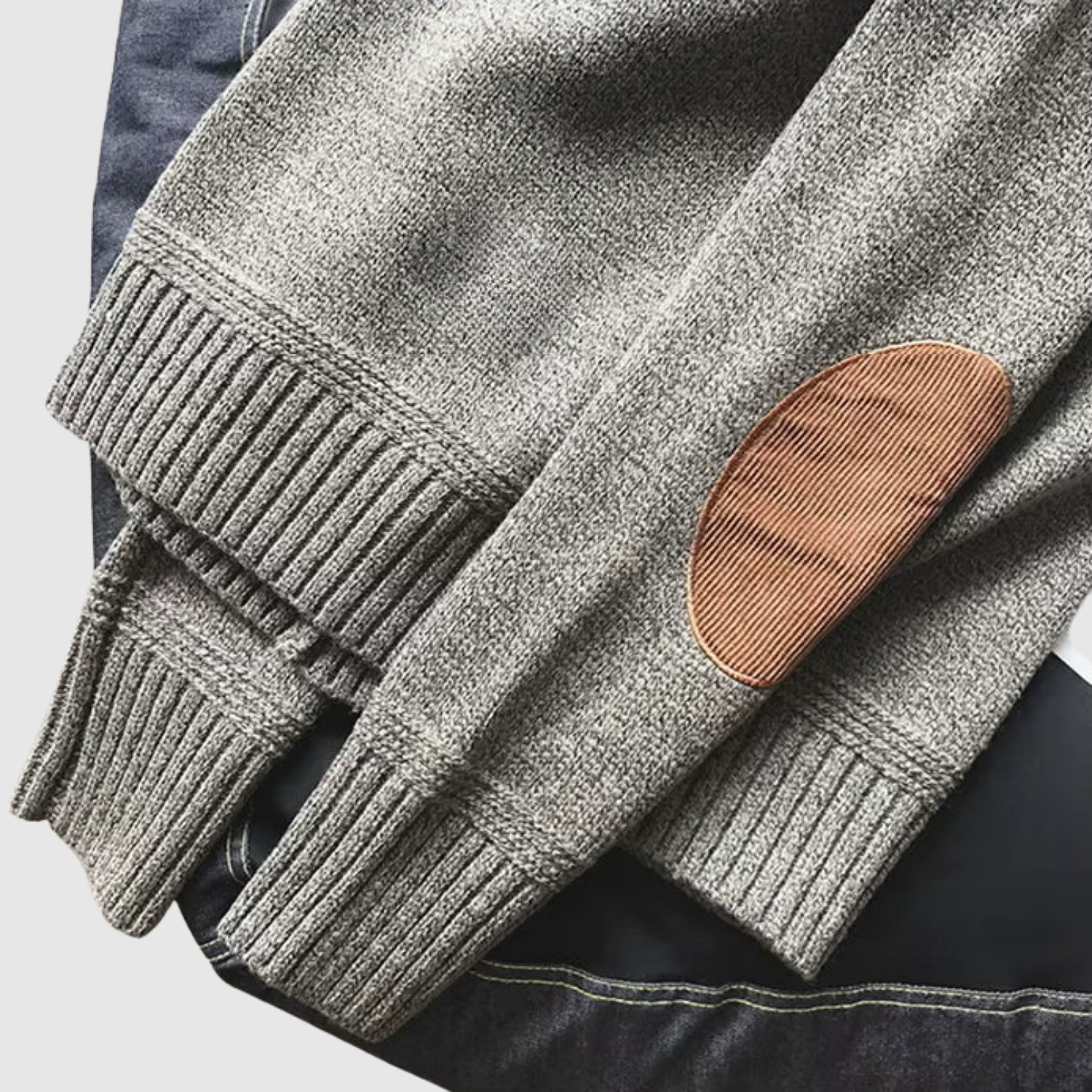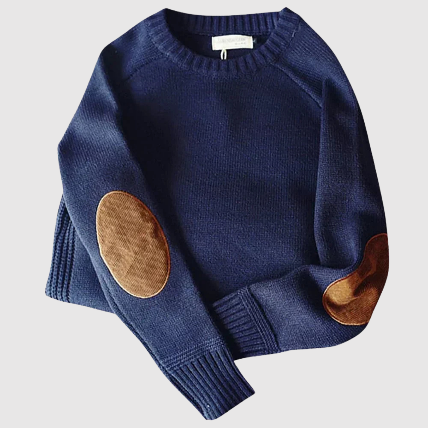 Този пуловер комбинира вечен дизайн с практични детайли. Лакти от велур придават изискан вид, докато мекото качество на плетивото осигурява комфорт и топлина в ежедневието.