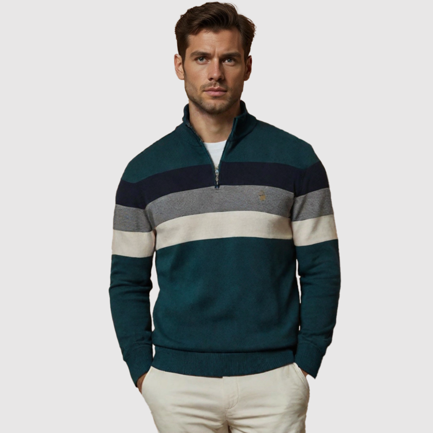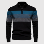 Модерен пуловер с половин цип и широки ивици, който създава стилен и мъжествен вид. Изработен е от мек материал, който осигурява както комфорт, така и топлина – перфектен за ежедневна употреба и по-неформални поводи.
