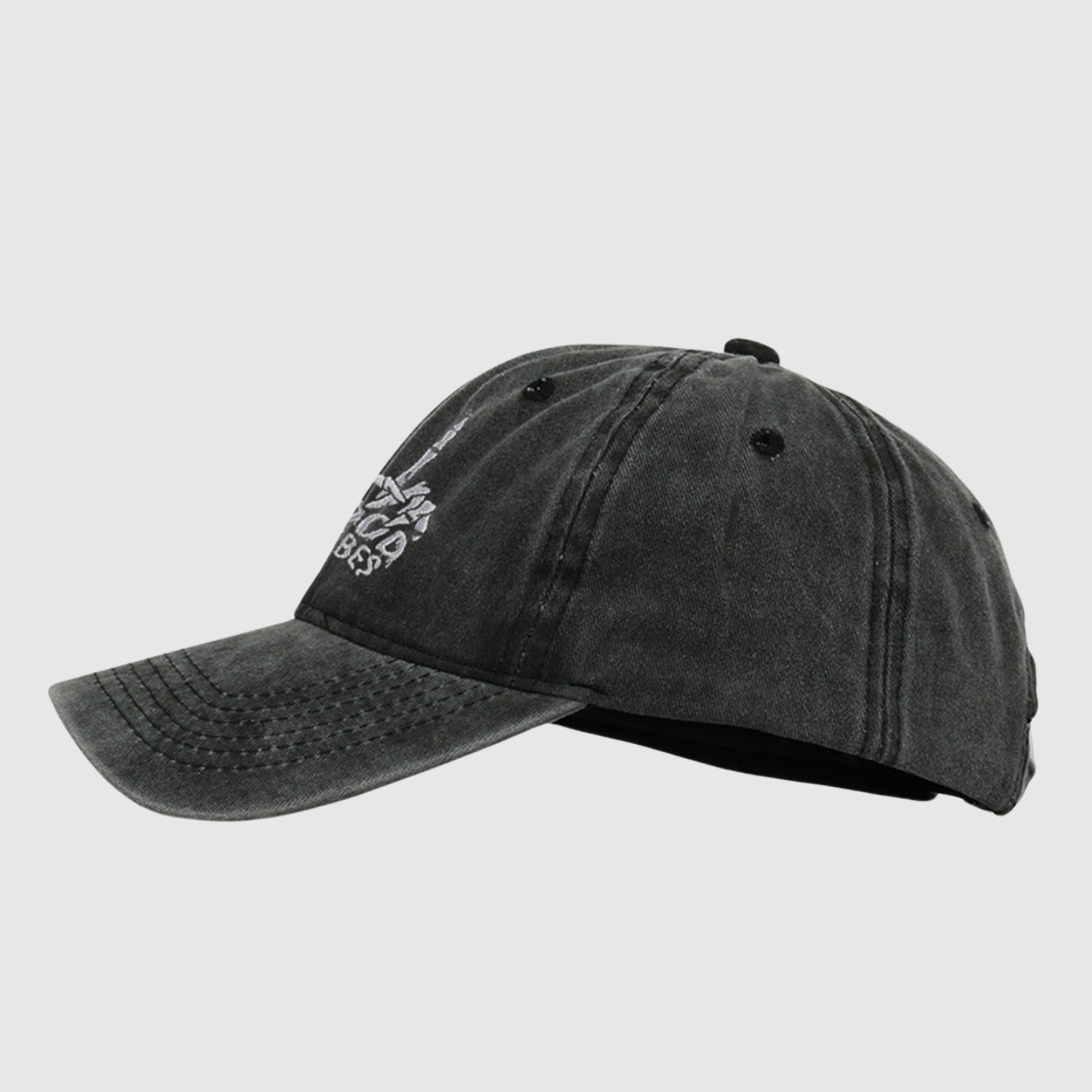 Класическа бейзболна шапка от винтидж обработен памук, украсена с бродирана корона отпред. Дизайнът придава небрежен и стилен вид, идеален за ежедневна употреба и свободно време.