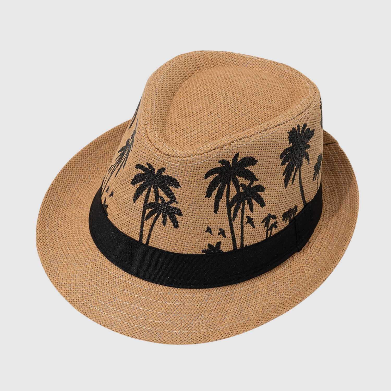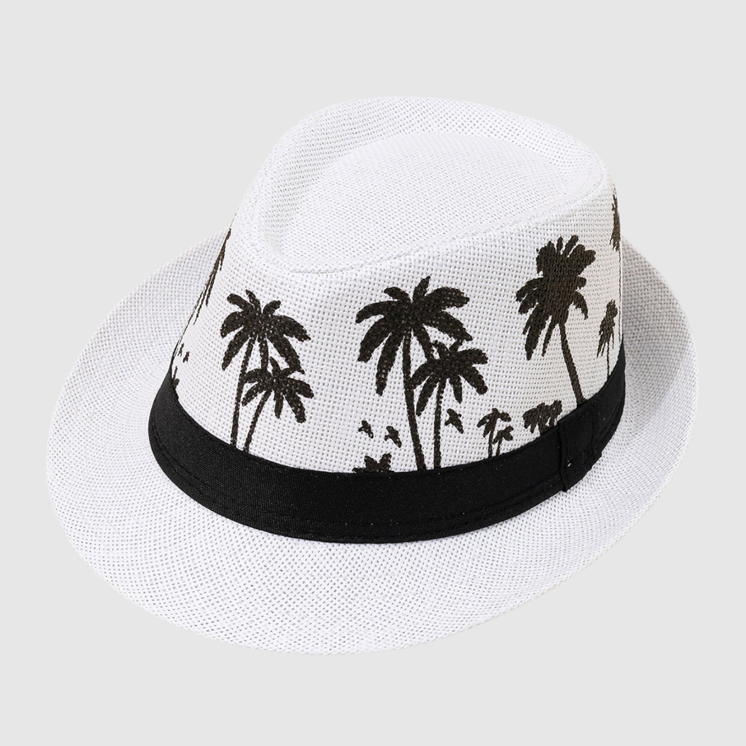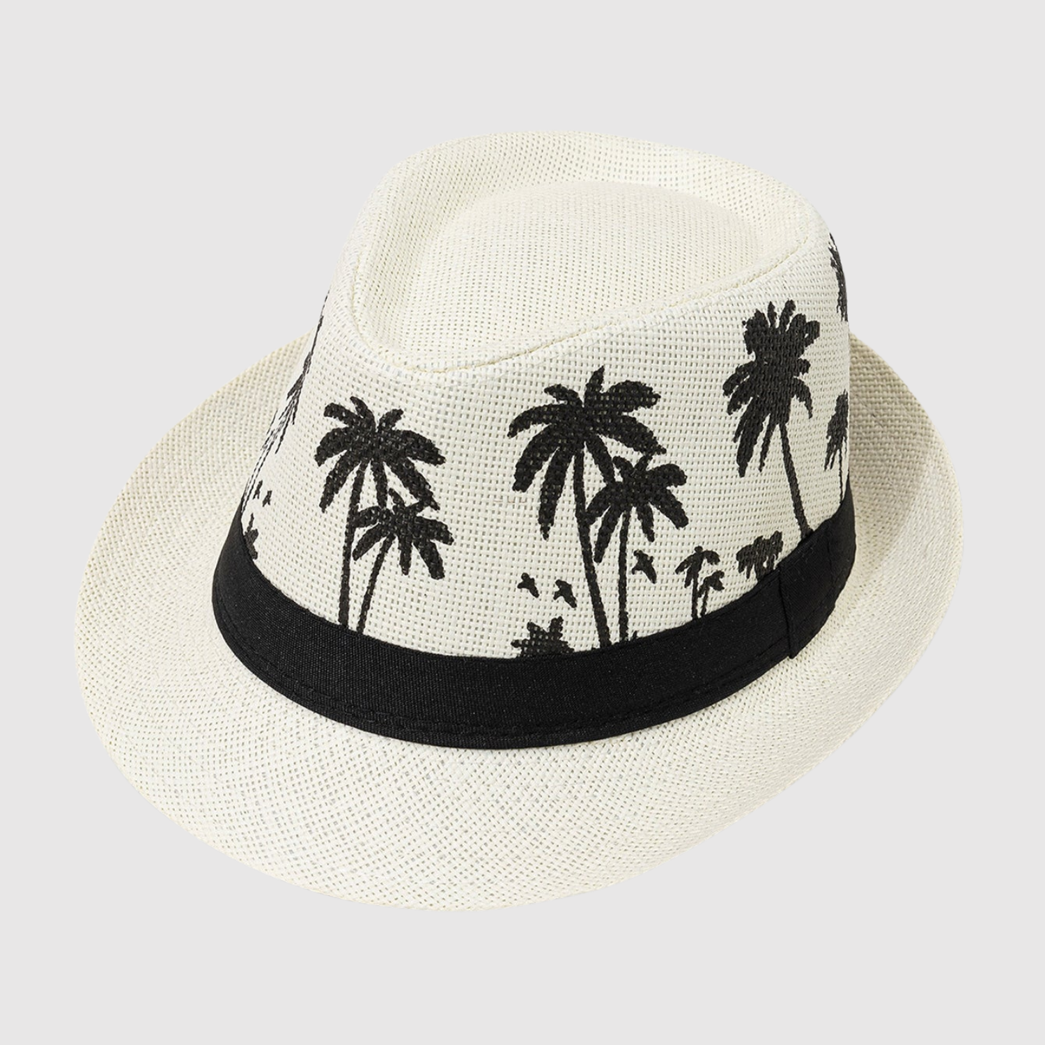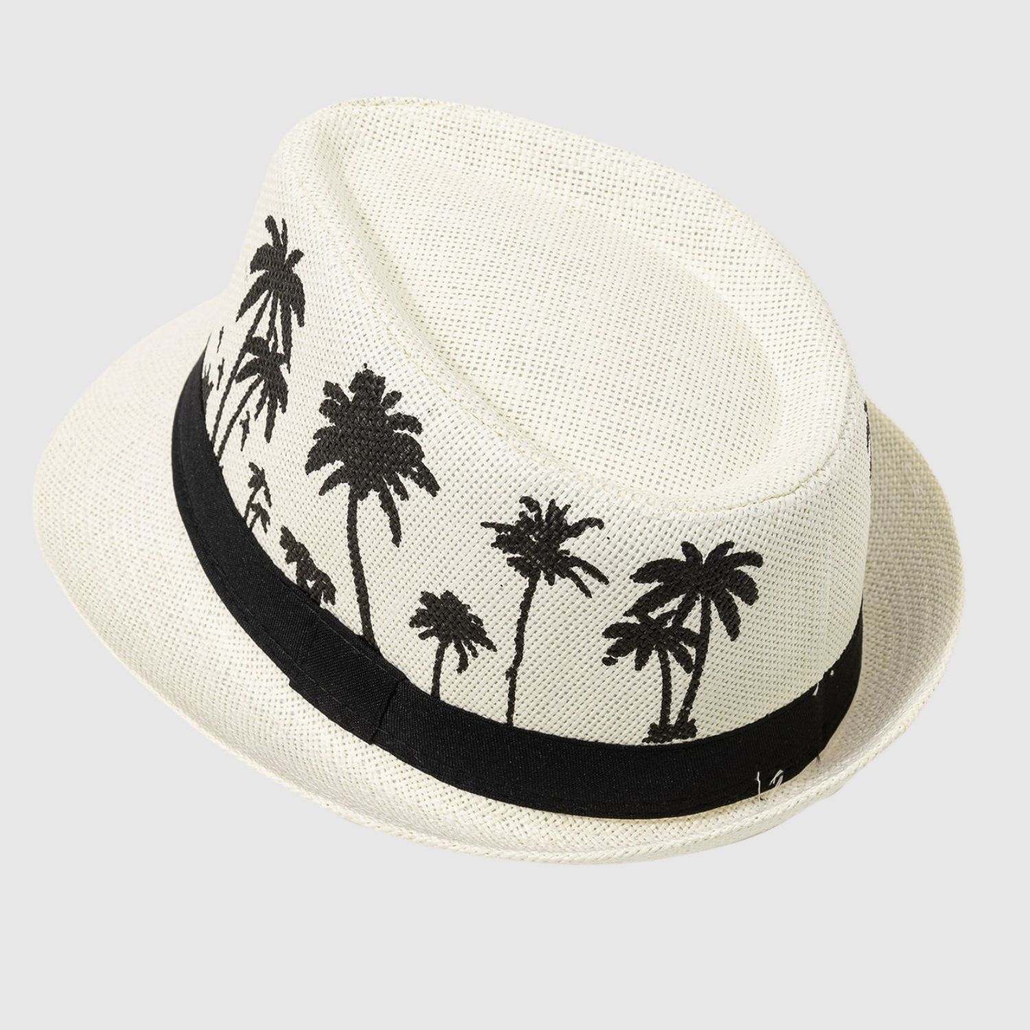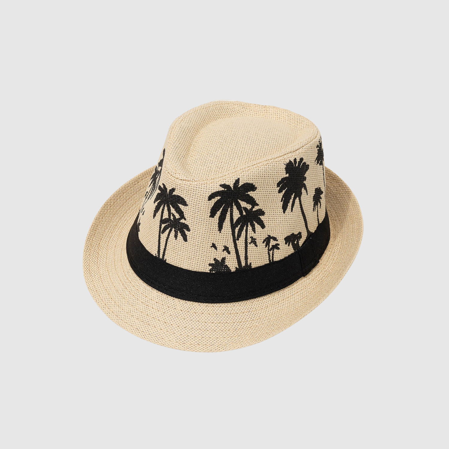 Лека и стилна слънчева шапка с вид на слама, украсена с декоративен палмов принт, който придава тропически нюанс. Тя е удобна за носене в горещи дни и същевременно предпазва от слънцето. Перфектна за плажни излети, ваканции или летни тоалети.