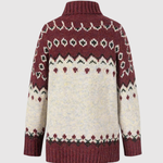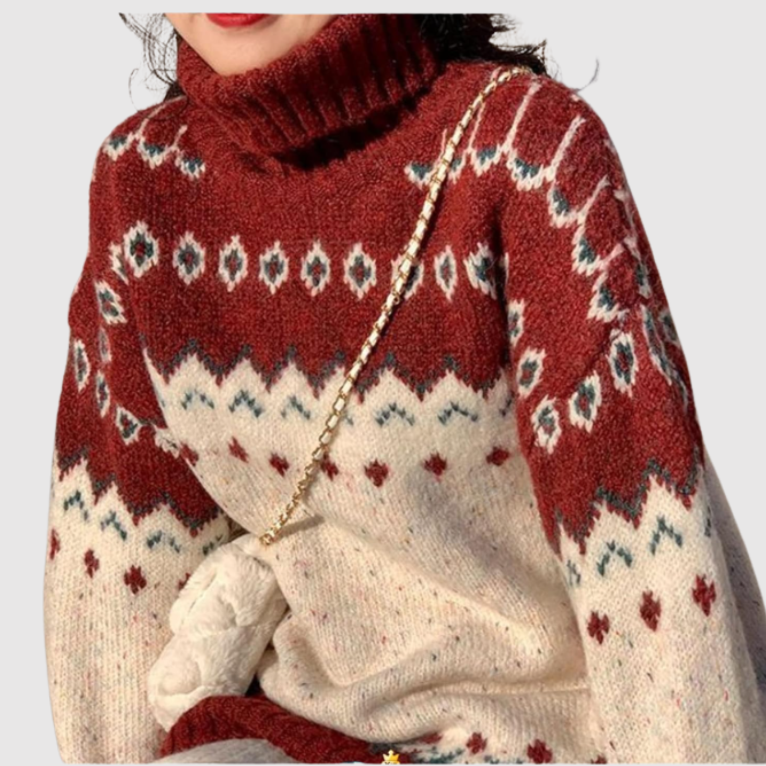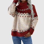 Този пуловер е вдъхновен от традиционните норвежки плетки, като съчетава топлина, комфорт и елегантност. Изработен от мека прежда с дебела яка и красив десен в червено и бежово, той е идеален за студените дни. Добавя нотка на празничен чар към всяка визия.
